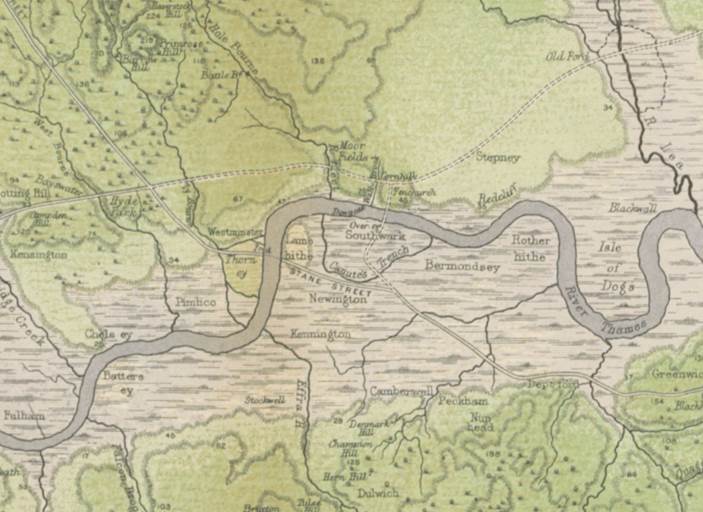 the Thames valley in London in physical contours: Pimlico is clearly labelled