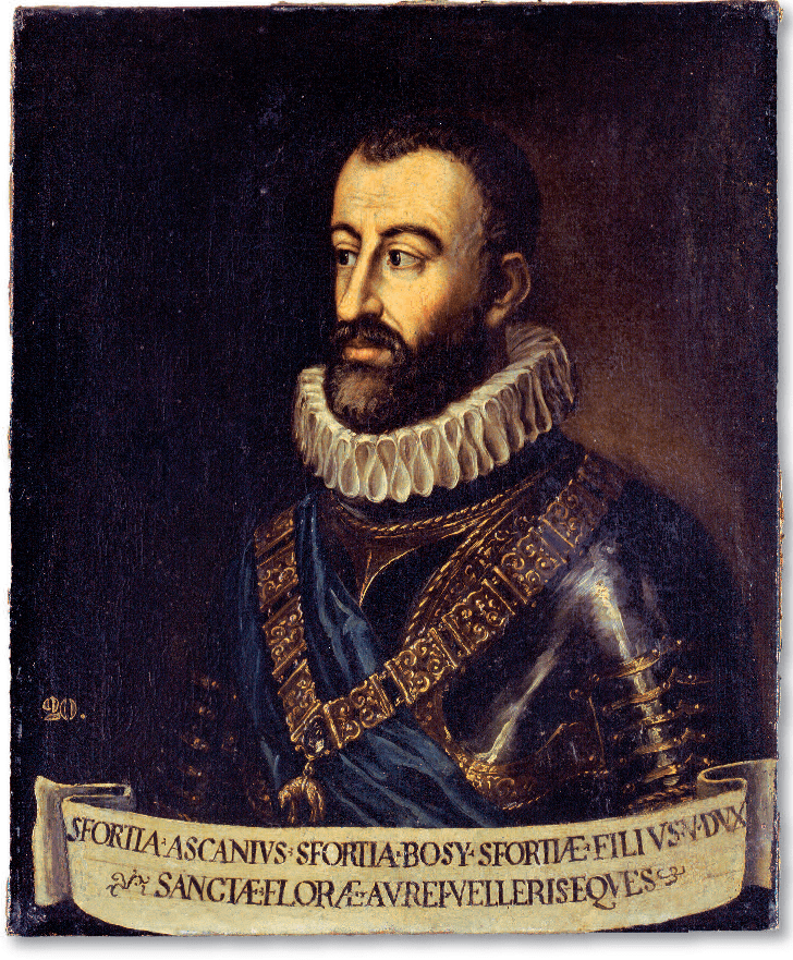 The second count of Santa Fiora was formerly recognised as sovereign by the nearby Republic of Siena in 1471. His grandson, Bosio II, re-established the family’s position in Italy after the fall of the main line in Milan, through his marriage to the illegitimate daughter of the Farnese pope, Paul III. He was named Governor of Parma (newly emerging as an independent Farnese principality) in 1527, and Commander of the Pontifical Guard in 1534. His brothers Ascanio and Alfonso became high ranking church officials, and his sons even more so, as practically extensions of the Farnese dynasty: the eldest, Guido Ascanio (in reversal of the norm, though not for Papal families) became a cardinal, bishop of Parma, and Camerlengo of the Church—the head of the Papal Household. Alessandro was also a cardinal, and succeeded his brother in Parma; politically, he became quite important as a mouthpiece of the Papal government at the Council of Trent in the 1550s-60s. The non-clerical brothers all became important military leaders in service of the Papacy and Parma, or leading mercenary troops in support of the Catholic party in the French Wars of Religion. Sforza Ascanio, the 10th count of Santa Fiora, was, like his father, Captain-General of the Pontifical Guard, Governor of Parma for the Farnese, then Governor of Siena for the Medici, and finally ambassador from Tuscany to the Imperial Count in Vienna, where he was awarded the collar of the Order of the Golden Fleece. The Sforzas were once again a family at the centre of international politics and diplomacy.