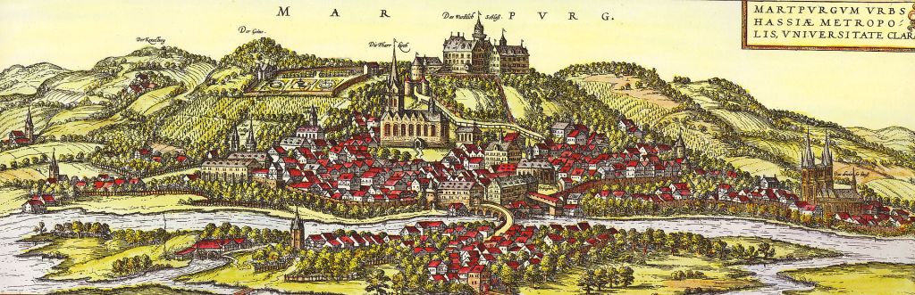 Halfway up the hill, I passed another Gothic church, the parish church of St. Marien, which houses some of the tombs of the landgraves of Hesse-Marburg. Crowning the hill is the castle itself, seat of the dynasty until its capital moved back to Kassel at the end of the 16th century. It was the site of the Colloquy of Marburg, 1527, hosted by the Landgrave Philipp the Magnanimous, who ardently wished to prevent a further split amongst reformers by inviting Luther and Zwingli to his castle to debate the finer points of the reform movement—others in attendance included Martin Bucer and Philipp Melanchthon—but it was ultimately a failure, and the Zwinglians continued to push for a more rigorous reform of the Church. It felt amazing to be in such an important historical spot. Today the castle is part of the University of Marburg, a space for its exhibitions and grand events. University buildings are scattered all over the hillside and as the town spills down into the river valley, and aside from theology, there are reminders in bookshop windows and theatre advertisements that this was also once a great centre of German Romanticism and the collecting of folklore by local scholars such as the Brothers Grimm.