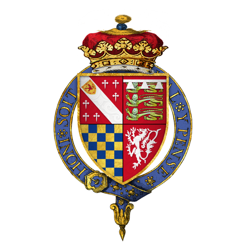 The new king, Henry VII, put the late Duke’s son and heir, Thomas Howard, into the Tower of London, and took away both titles, Norfolk and Surrey. But by the end of the 1490s, he was back in favour and highly involved in the royal government. He was restored to the earldom of Surrey in 1489, and named Lord High Treasurer in 1501. He even married his son Thomas to Lady Anne of York, sister-in-law to the King himself. When Henry VIII succeeded as king in 1509, the Earl of Surrey acted as Earl Marshal at his coronation; and when the young king went overseas to fight the French in 1513, it fell to Surrey to lead an army north to defend the borders against invading Scots. The battle of Flodden was so disastrous for Scotland—the King (James IV) himself was killed on the day—so Surrey was allowed to resume his father’s old title, Duke of Norfolk (from 1514), and honoured with an ‘augmentation’ to his coat of arms: the Howard arms consisted of a silver bend on red, surrounded by six ‘cross-crosslets fitchy’, to which was now added, on the bend, a Scottish lion, cut in half, with an arrow shot straight through its head. He also added the arms of the De Warrenne family—one of the greatest magnate dynasties of medieval England—the blue and gold checks of the old earls of Surrey.