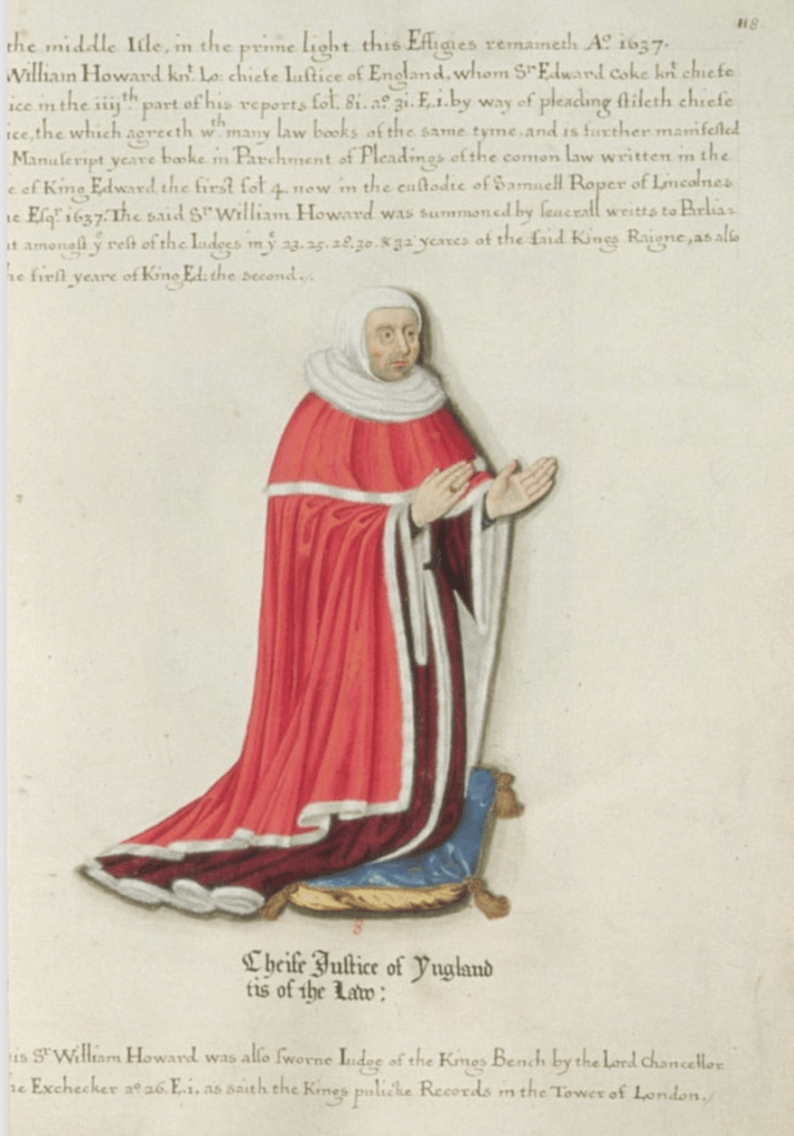 Either of these are of course possible. According to records, however, the first identifiable ancestor is Sir William Howard, a prominent lawyer and judge from the area near King’s Lynn in Norfolk, who rose to prominence in the 1270s and was named one of the justices of the Common Pleas in 1297. He held lands in Wiggenhall, just south of Lynn, and purchased the nearby manor of East Winch in 1298. His first marriage solidified his social rise, by connecting him to the family of Ufford, magnates from Suffolk (and soon to be created earls of Suffolk, 1337). Their son was named Sheriff of Norfolk and Suffolk and Governor of Norwich, and obtained a position at court too, as Gentleman of the Bedchamber of Edward I. He moved the family even closer to royal circles by marrying Joan de Cornwall a daughter of an illegitimate son of Richard, Earl of Cornwall, younger brother of Henry III.