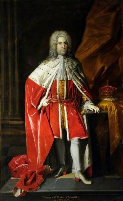 The 6th Duke of Norfolk had sailed back in 1680 in time to vote against his uncle, and returned permanently by about 1683, but died soon after. His son Henry now took over as 7th Duke. It was he who did much to redevelop the family’s estates in the north of England. Having broken with his father over his relationship with a long-term mistress, which he considered damaging to the family’s relationship in society, the 7th Duke himself suffered social scandal as the result of a long adultery trial and eventual divorce from his wife, Lady Mary Mordaunt, in 1685 (she later remarried her lover, Sir John Germain). While he remained a Catholic in private, he publicly conformed, and restored his family’s position at court by not supporting the Catholic James II in 1689, and was rewarded with a seat on the Privy Council by William and Mary. He died in 1701, and the senior Howard titles passed to his nephew, Thomas, of Worksop.