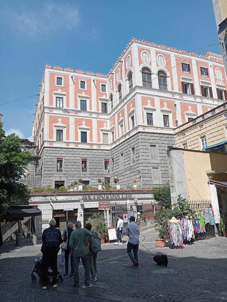 The Princess of Leporano came from a long line of Neapolitan aristocrats. The Caracciolo family had dominated politics in this region for centuries, claiming origins in the Byzantine nobility (as ‘Caracziolus’) who had implanted themselves in southern Italy by at least the 10th century. There were many, many branches (and the family will certainly have their own blog post), each with a duchy or a principality (or several). One branch added the name Giudice by marriage in 1722 to the heiress of Antonio del Giudice. This Neapolitan aristocrat is better known as the Prince of Cellamare, and was famous for his involvement in the ‘Cellamare Conspiracy’ as Spanish ambassador to France in 1718-19. Together with the Duke of Maine (Louis XIV’s illegitimate son), the plotters attempted to depose the Duke of Orléans and put Philip V of Spain in his place as Regent of France. Cellamare was arrested then sent home, and France soon declared war on Spain. The Prince returned to Naples where he set about expanding and beautifying his palazzo, one of the most prominent in Naples still today, the Palazzo Cellamare (often spelled Cellammare). This grand residence, on the boundary between the ancient city of Naples and its new suburb of Chiaia, rises high above the Via Chiaia, a very fashionable shopping street. It was built by one of the Carafa princes in the early 16th century, and following the death of the last member of that branch in 1689, it was taken over by the city, then sold to the Prince of Cellamare. In the 1720s, he built a new chapels and expanded the enclosed gardens that covered the hillside. In the later 18th century the palace was the home of the Prince of Francavilla (Michele Imperiali) who was a great art collector and host of Neapolitan high society. In the early 19th century, the palace hosted the collections of the royal family itself, who feared they might be looted by the French in the revolutionary era. A massive restoration project was started at the Palazzo Cellammare in 2021, notably re-opening a 1940s cinema, the ‘Metropolitan cine-theatre’, built in its underground foundations, and considered the largest cinema in Naples, with 3000 seats.
