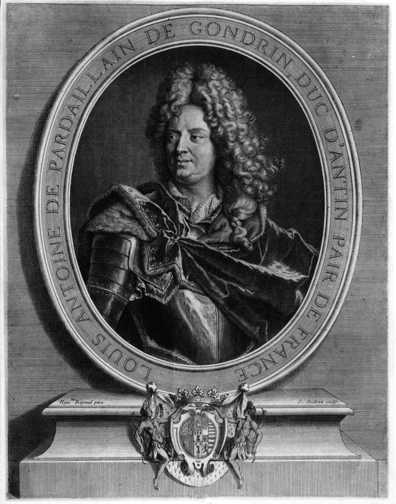 Much of the Marquis d’Antin’s career was, naturally, promoted by his mother. Even though her star was in the wane after 1680, she brought young Louis-Antoine to court from Gascony in 1683, secured him a military commission, but more importantly, drew him into the circle of the (then assumed) future king, the Grand Dauphin, by marrying him to the grand-daughter of the Dauphin’s old governor, the Duke of Montausier. He also became close to his and the Dauphin’s half-brothers, the illegitimate sons of the King. The year of Antin’s marriage (1686) he was appointed Lieutenant-General of Upper and Lower Alsace, the military equivalent to the governor of the province, but failed to make more of an impact at court until after his disgraced mother died in 1707. In that year he was appointed Governor of Orléannais, a more substantial province (and closer to court) than Alsace; and the next year was named Superintendent of the King’s Building Works. This was an unusual appointment for a noble grandee—normally it was held by one of the King’s lower-ranking ministers—but it brought Antin great access to the King who loved his building projects, and also gave Antin access to all the King’s greatest architects and designers, whom he employed on his own projects at Petit-Bourg and Bellegarde. It turned out he was a very good organiser, and helped Louis XIV and then Louis XV on their various building projects at Versailles and other royal sites. Antin also built his own grand residence in Paris, the Hôtel d’Antin, in the area just on the northwest edge of the old city, in the district now close to the grand department stores. The house no longer stands, but one of the streets in the area bears its name, the Chausée d’Antin.
