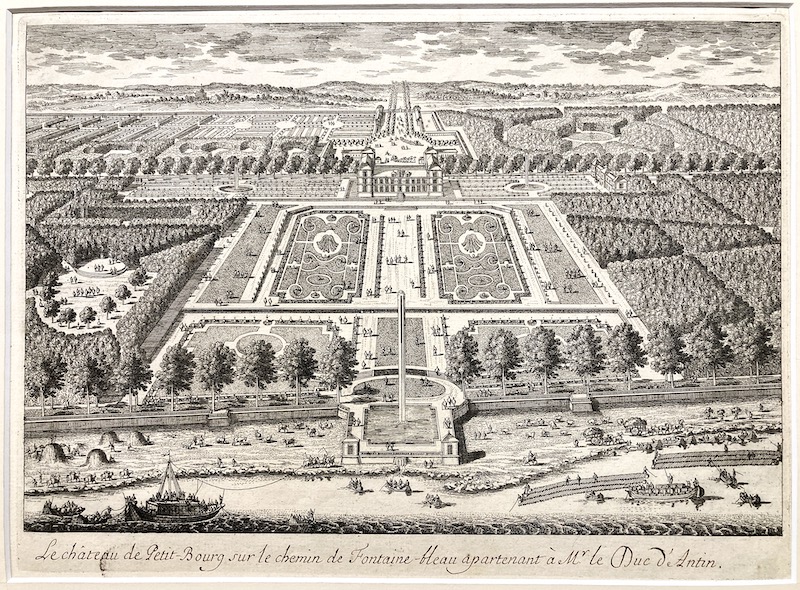 In 1695, Madame de Montespan purchased a house in the town of Evry, on the heights above the Seine southeast of Paris (on the road to Fontainebleau), as a retreat for herself, Petit-Bourg. When she died in 1707, it passed to her son, Antin, who reconstructed it on a grander scale from 1716, notably its gardens, and when his line died out in the 1750s, it was purchased by the widow of a Parisian official who demolished it and built another—the neoclassical building seen until 1944, when it too was destroyed.