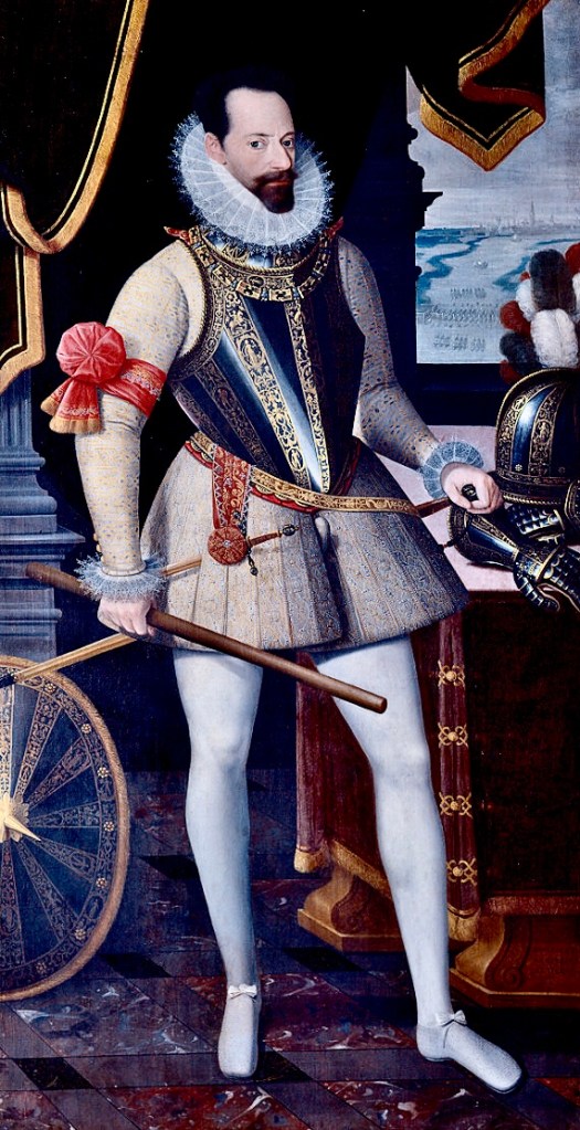 In 1586, Alessandro Farnese succeeded as 3rd Duke of Parma and Piacenza. He entrusted these duchies to his teen-aged son Ranuccio—legally old enough to rule, but in need of adult guidance since both his mother and now his grandmother were dead—while he remained to command Spanish forces in the Low Countries. Parma defeated the English troops sent by Queen Elizabeth I to aid the Dutch, and in 1487 secured the port of Sluis in Zealand—ready for an invasion of England once the grand Armada arrived from Spain. Of course, as is well known, the ‘Protestant Wind’ blew the Armada out of the Channel, so no landing was possible. Still hoping to secure victory in the Low Countries, Parma found himself pulled away as Philip II ordered him to France in late 1589 to aid the Catholic League in their defence of the true faith from the usurping claimant king, Henry of Navarre. With Parma’s aid, they did prevent Navarre from taking Paris, and again in Spring 1592 the same for Rouen, but by this point the great commander was getting sick and was pulled back and forth between France and the Netherlands, where the armies of Maurice of Nassau were growing in strength every day. Journeying once more to France in December 1592, he weakened in the border town of Arras and died.