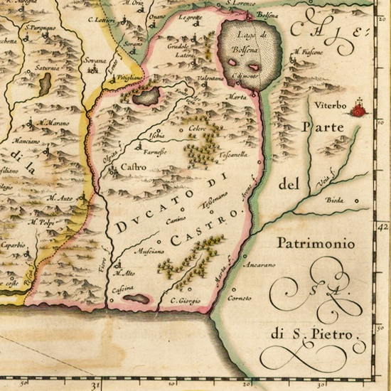 Duke Mario had numerous sons, who succeeded as Duke of Latera in succession. The last of these was Girolamo, who was also a cleric when he became the last duke in 1662. He had been Apostolic Nuncio to the Swiss Cantons in 1639, then Governor of Rome in 1650 and Prefect of the Apostolic Palace and Governor of Castel Gandolfo (the papal country retreat) in 1655. Finally elevated to the cardinalate in 1657, he then succeeded as Duke of Latera and governed for six years before he died in 1668. With no heirs, the fief returned to the Papacy. There were now no Farnesi in Lazio at all.