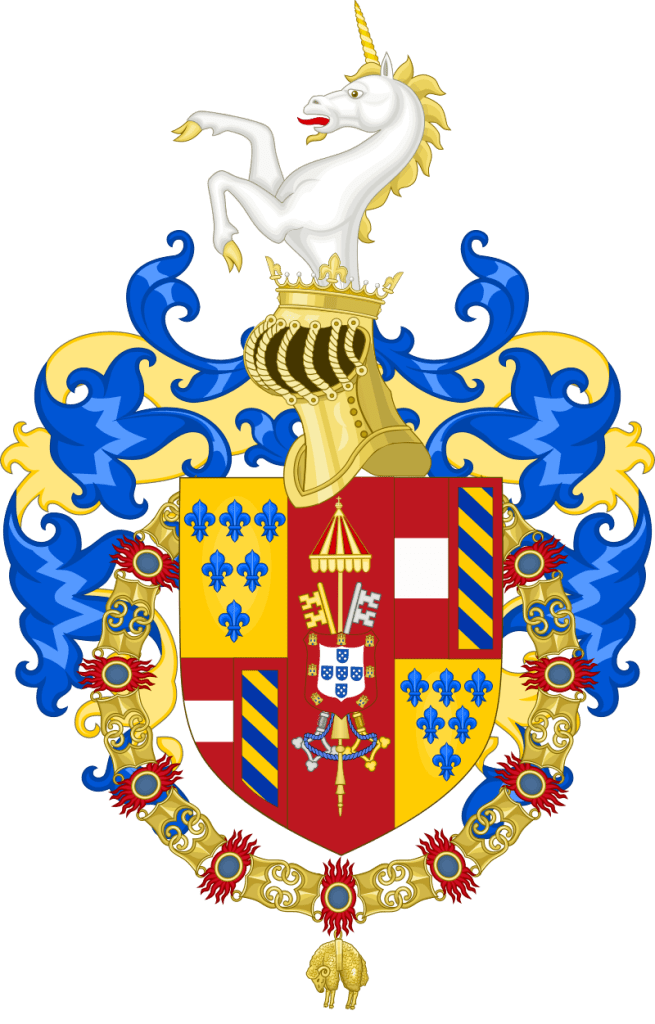 The new duke of Parma and Piacenza (and don’t forget, duke of Castro as well), Ranuccio I, now 23, would have a long and mostly successful reign. As a teenager there was a brief glimpse of a much grander future, for him and for the Farnese dynasty, as he was put forward in 1579 as a successor to the childless uncle of his late mother (she died in 1577), Henry, the Cardinal-King of Portugal. But Philip II of Spain had a strong claim too, and given Parma’s quite strong connections to Spain at this time, when King Henry died in 1580, Ranuccio’s claims were not pressed (though later generations did add the arms of Portugal to the Farnese coat of arms, see above).