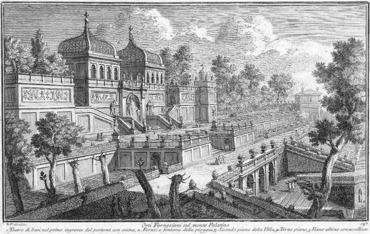 Also in Rome, Cardinal Alessandro built a summer house and gardens on the slopes of the Palatine Hill (the Farnese Gardens, built in the 1550s), with different spaces devoted to pleasure or to botanical research. He sponsored the building of the main Jesuit church in Rome, the Gesù (in the 1560s), and chose it as his burial place.