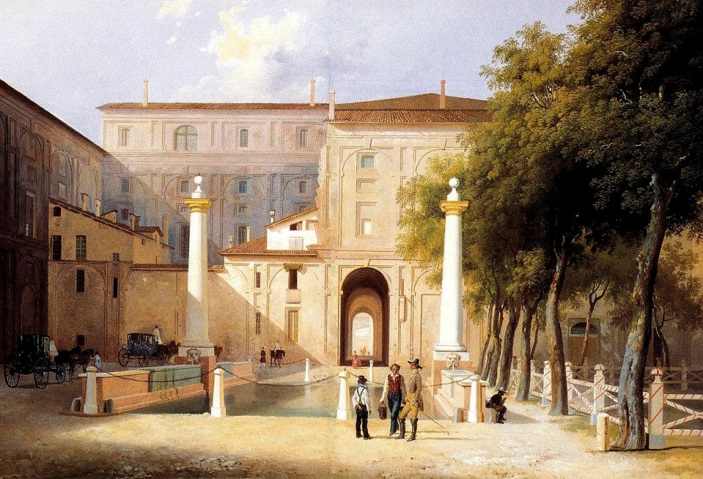 Across the Tiber, in the more leafy suburb of Trastevere, the Farneses acquired a villa built earlier in the century by the wealthy Chighi banking family. This villa, famous for its Raphael frescos of ancient Greek myths, was renamed the Villa Farnesina. It later was the residence of the Bourbons of Naples when in Rome, but after the unification of Italy in the 1860s it became the residence of the Spanish ambassador. Now it belongs to the state and houses the Accademia dei Lincei.