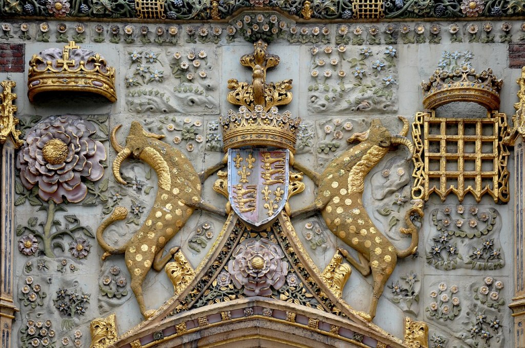 The pretensions of the House of Beaufort that clashed so intensely with the House of York can be seen visually in their coat-of-arms: the golden lions of England quartered with the lilies of France, made different to the royal arms of England by a border of alternating blue and silver (known in heraldry as a ‘bordure compony’). These arms were supported by one of the most curious of heraldic animals: the ‘Beaufort yale’. A yale was a mythical beast, like an antelope but with tusks and horns that could swivel in any direction. Under the Tudors it became one of the ‘king’s beasts’ and can be seen in statue form today in front of Hampton Court Palace.