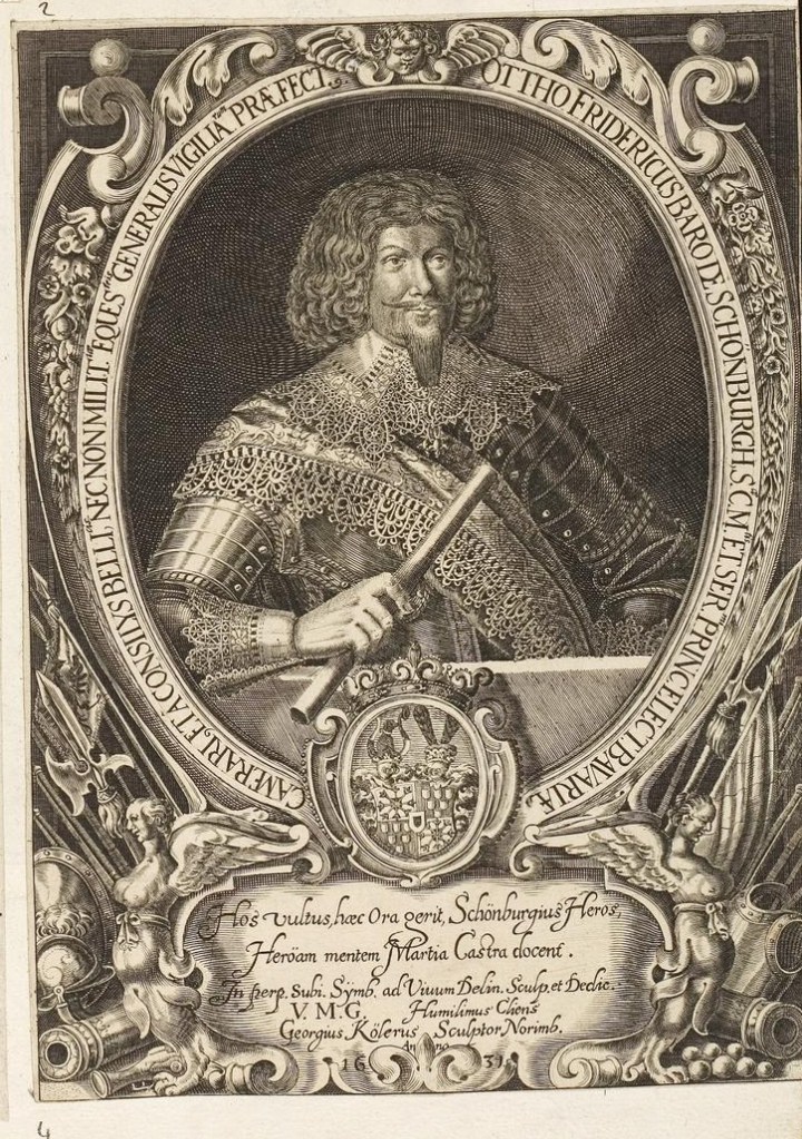 Over the centuries, the family divided into several lines and went into service of either the imperial archbishops (Cologne, Trier, Mainz), or one of the powerful territorial lords, like the Elector Palatine or the Count of Nassau. One branch remained Catholic and was most famously represented by Baron Otto Friedrich von Schönburg, a General Field Marshal for the Catholic League in the Thirty Years War (killed at the Battle of Breitenfeld in 1631). His brother and heir, Johann Karl, was an Imperial councillor and was created Count von Schönburg in the 1630s. He was also Count of Montigny and other places in Luxembourg due to an ancestor’s marriage in the previous century.