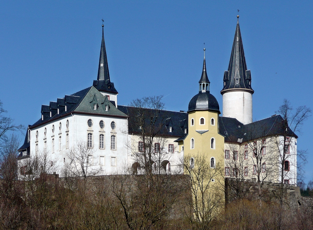 Lichtenstein Castle is perched on a hilltop overlooking the Zwickauer Mulde valley. It is mentioned as a lordship as early as 1212, given by the Emperor to the King of Bohemia (thus making its feudal position complicated later on), then leased by the latter to the Schönburg family. It was destroyed and rebuilt several times over the centuries, taking its current form in the middle of the 17th century. In 1797 a family crypt was built here and it houses several generations of the family. After 1945 it was used as a Catholic charity retirement home, until 2000 when it was re-acquired by the Schönburg family; in 2014 the local government forced its resale to developers and there is a strong local town historical group working to restore the largely decayed building.