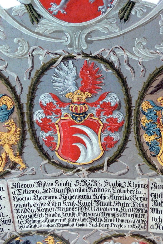 The Kinsky family emerged from legend into history in the early 13th century with the possession of an estate in northwest Bohemia around the village of Vchynice, from which they took their name. This is just outside the town of Lovosice on the great river Elbe as it flows north towards the mountains separating Bohemia from Saxony. Their lands were downriver from the estates that formed the core of another Czech house that survived the great purge of the native nobility by the Habsburgs in the 1620s, the Lobkowitz family, seen in a previous blog post. By the 14th century, the owners of Vchynice had taken it as their surname, and eventually dropped the first letter to be instead Chynsky (or ‘Chinitz’ in Latin sources), and added z (‘of’) Vchynic, or von Wchinitz in German. Today the family name in Czech is spelled Kinští, but they are commonly known in other European languages including English as Kinsky. They are not, it should be noted, related in any way to the famous family of actors descended from Klaus Kinski, whose original name was Nakszynski and who emigrated from northern Poland to Germany.