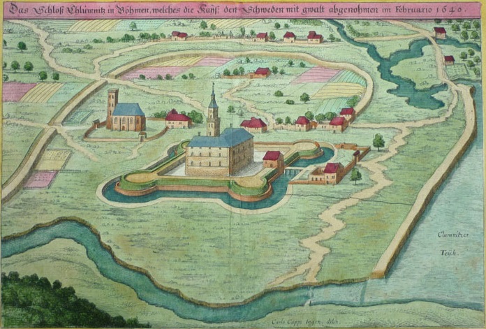 The youngest of all those brothers, Jan Oktavián, in the years before the uprising, had been chamberlain of Emperor Matthias (successor of Rudolf II), and obtained the castle and estate of Chlumec nad Cidlinou, in 1611. This castle on the river Cidlina is northeast of Prague, built in the 15th century and expanded by the Pernštejn family in the 16th. It was the Kinsky seat until a new castle was built in 1721-23 just outside the town, Karlova Koruna (see below). The older castle fell into disrepair and was finally town down in the 1960s.