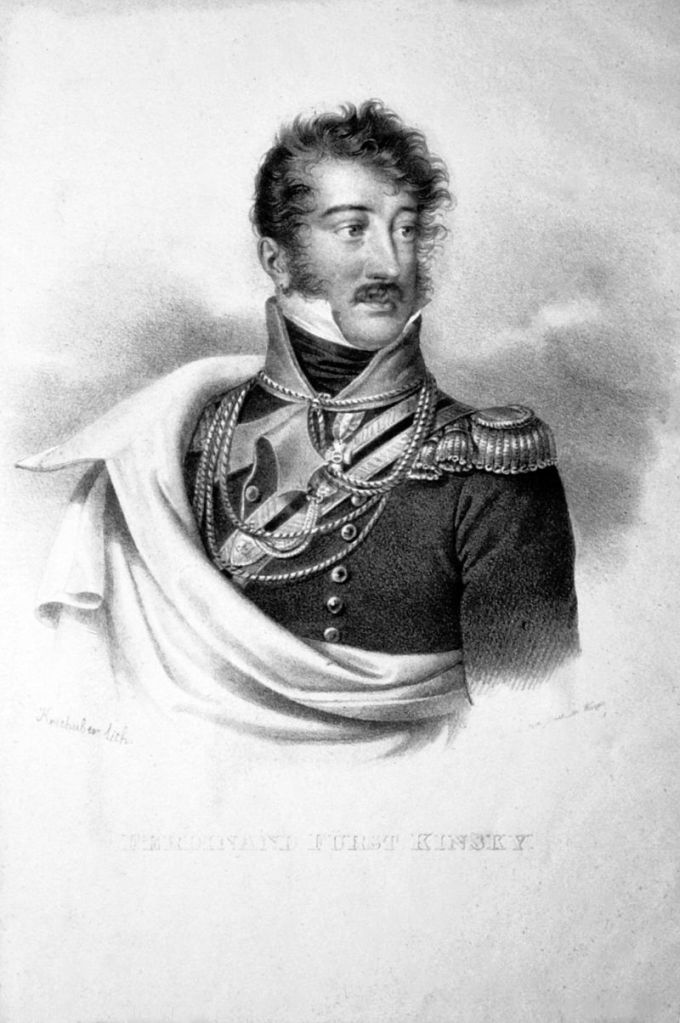 František Ferdinand had three sons, all high-ranking military commanders in the second half of the 18th century. His second son Joseph in particular was Commander of the Army of Hungary in 1787, then of the entire Habsburg army in 1788. His younger brother Franz Joseph became Director of the Theresian Military Academy in Vienna, founder of an army cadet school in Prague, and all-round pedagogical wonder of his century. The eldest, Leopold Ferdinand married a Liechtenstein princess and founded the senior line of the Kinskys, the Chlumsky Branch. There are still several Kinsky counts around descended from this line, but they are not princes.