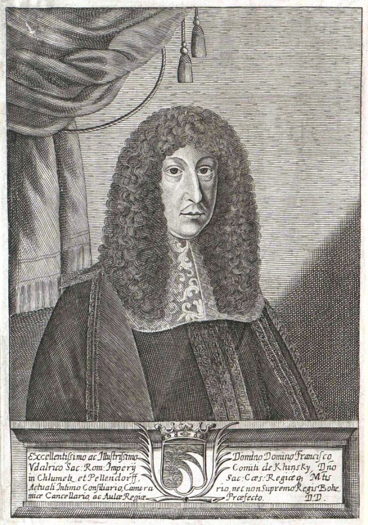 His son Count František Oldřich (Franz Ulrich) (d. 1699) was thus Master of the Court and also High Chancellor of Bohemia, 1683, and a member of the Emperor’s privy council from 1689. In the 1690s he was one of the leading members of the Imperial court and led important negotiations with the Ottomans. Two other Kinskys held the highest judiciary office in the Kingdom of Bohemia: František Oldřich’s brother Václav Norbert (d. 1719), in 1705-1711, and the latter’s son, František Ferdinand (d. 1741), 1723-36. The latter was a diplomat and organised the election in Frankfurt of the Archduke Charles of Austria as Holy Roman Emperor Charles VI in 1712.