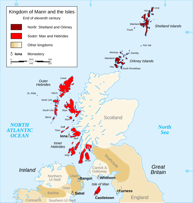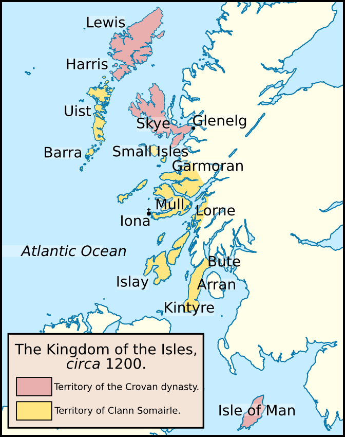 Dugall mac Somairle only held on to Man for about a year, before it was taken back by his mother’s family the Crovens, with help from the King of Norway. The Kingdom of the Isles was thereafter divided: the northern Hebrides (Lewis, Harris, Skye) and the Isle of Man returned to the Crovan Dynasty, while the southern Hebrides (Mull, Islay) and the mainland territories were retained by Clan Somairle.