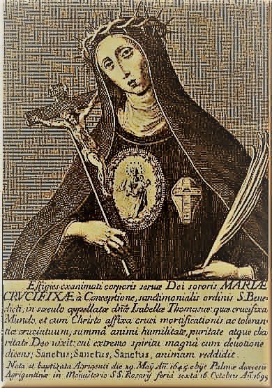 Both Giulio and Rosalia were known for their piety—he’s nicknamed ‘il Duca Santo’. After they had six children, they agreed to live together chastely. But in about 1660, obtained permission from the Pope to formally separate; he retired to a monastery like his brother, while his wife and four daughters retreated the new cloistered Benedictine monastery of Palma: his wife as ‘Suor Maria Seppellita’, his eldest daughter Francesca as its abbess, and Isabella as ‘Suor Maria Crocifissa’. The latter became known for her extreme devotion to penance and suffering, and for a letter dictated to her in her cell by Satan himself in 1676, written in demonic language and still undeciphered, despite recent attempts using decryption and AI software. Sister Maria of the Crucifixion is known as ‘Blessed Corbera’ in Il Gattopardo (Corbera being the surname of the fictional family of the Prince of Salina). Shortly after her death in 1699, the Bishop of Agrigento ordered a hagiographic biography to be written and requested the opening of a case for her beatification, but she only got as far as being declared ‘venerable’ in 1787.