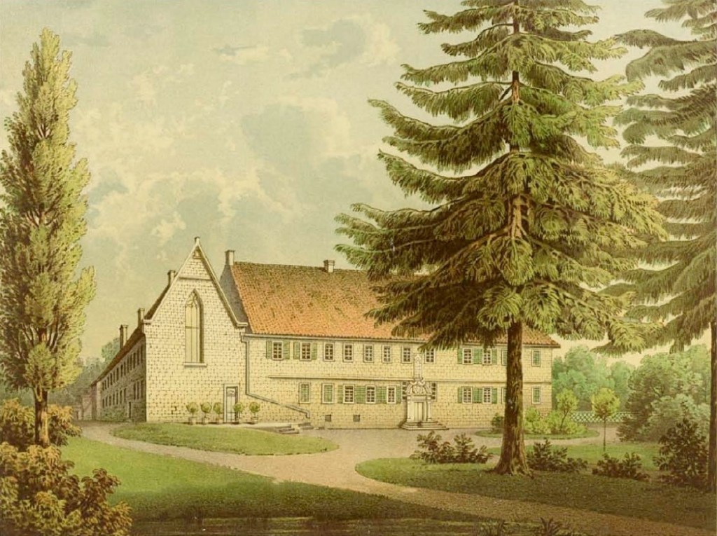 Bentlage was founded as an abbey for the Order of the Holy Cross (sometimes called the Crusader Brothers) in 1437. It was never huge and by the eighteenth century had only about a dozen resident friars. It was secularised in 1803, and given to the new Prince of Rheina-Wolbeck as its seat. When Joseph Arnold died in 1827, the property passed to Count Florent-Stanislas de Lannoy-Clervaux, and it stayed with his descendants, renovated as a country seat, until 1912, then passed back to Looz-Corswarem heirs, until they died out in 1946 and it passed to another family. Acquired by the city of Rheine in 1978, it has been turned into a museum.
