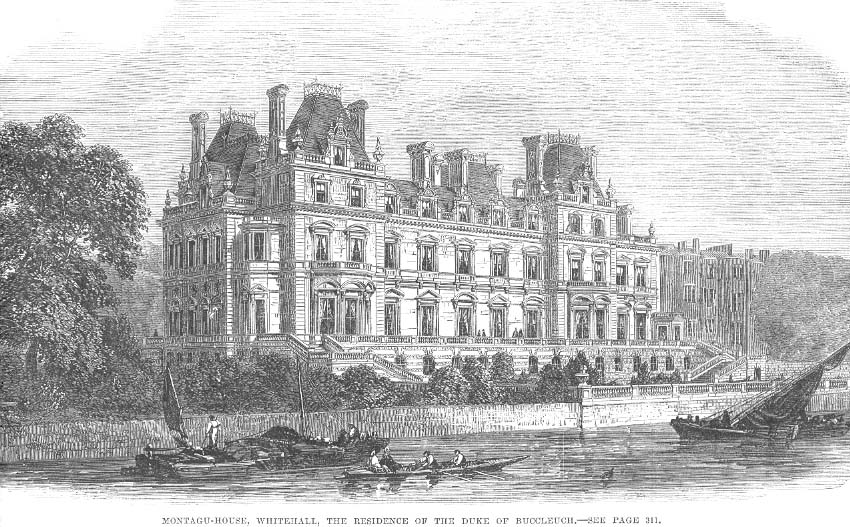 The 5th Duke, who died in 1884, had three sons: the youngest, Lord Charles, was an admiral in the navy with a very long career; the second, Lord Henry, became Baron Montagu of Beaulieu and started a junior line, about which more below. The eldest, William, was, as the Earl of Dalkeith, an active MP in the 1850s-80s, and established his London residence at Montagu House on Whitehall Street. This was a townhouse with frontage on the Thames, initially built in the 1730s by the 2nd Duke of Montagu, on a site previously part of the medieval residence of the archbishops of York. The Georgian mansion was replaced in the 1850s with a much larger, and fairly unusual French Renaissance style house, one of the grandest private mansions in London. In 1917 it was taken over for use as government offices, and was demolished in 1949 (the site is now part of the Ministry of Defence).