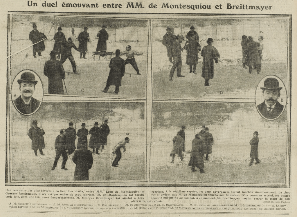 In the next generation, Count Léon de Montesquiou was at first a historian, writing a doctoral dissertation on the suppression of the noble duel, then from 1900 a leading member of the far-right nationalist and royalist party, Action Française. Vocally opposed to the government that had overturned the Dreyfus judgment in 1906, his comments calling for violent overthrow caused him to be removed from his post in the army reserve. Perhaps ironically, and in the spirit of the Musketeers, he was involved in a duel with a political opponent in November 1911. When war broke out, Montesquiou was re-integrated into the army and was killed in combat in September 1915.