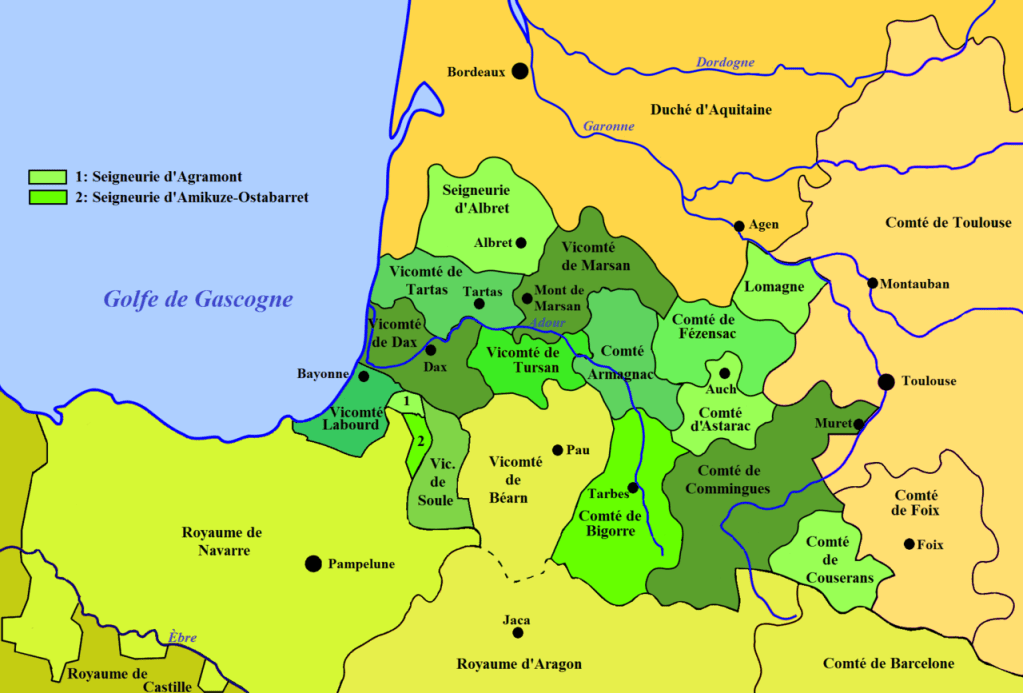 A few years later Sance II reunited different parts of Gascony, both the inland valleys and along the Atlantic coast, and thus revived the title ‘duke’ in about 851, establishing a de facto independent state in defiance of any loyalty to the Frankish empire. His son (or at least relative) Garcia Sanchez (or as he’s known in French, Garsie-Sance, or Gassia Sans in Gascon) was called Duke of Gascony, but also Count and Marcher Lord of the Ocean Coast and Count of Bordeaux. When he died in about 925, his lands were divided into three parts for his sons. The eldest, Sance-Garcie, continued the line of dukes of Gascony until 1039 when the duchy passed into the possession of their more powerful neighbours to the north, the dukes of Aquitaine (of the House of Poitiers), whose heiress, Eleanor of Aquitaine, took it to the House of England through her marriage to Henri of Anjou in 1152. The third son, Arnaud-Garcie received the county of Astarac and founded a lineage that ultimately included—or so they claimed—the family of Saint-Lary, which will have a blog post due to the Duke of Bellegarde. The middle son, Guillaume-Garcie (or Guillermo), was given parts of central Gascony called the counties of Fezensac and Armagnac. The latter split off in the next generation and would form the House of Armagnac, the most powerful medieval noble family in southern France, and for a time in all of France (the fifteenth century), gaining ducal status as dukes of Nemours, before dying out in 1503.
