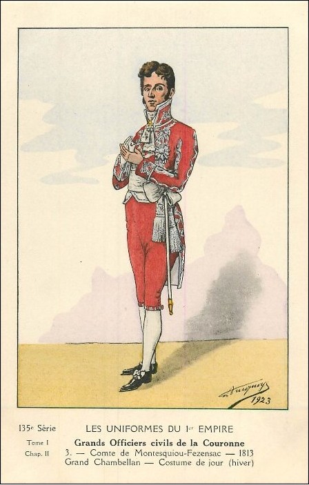 The Abbé de Montesquiou was a member of the Académie française from 1816, and appointed to the Chamber of Peers as Count of Montesquiou-Fezensac in 1817. This was then raised in rank to Duke of Fezensac (sometimes written Montesquiou-Fezensac) in 1821, though I’m not certain why: perhaps the fairly moderate Louis XVIII wished to keep him on side in the face of the increasingly conservative opposition led by his brother Artois, the future Charles X. When ultimately Charles X was toppled in 1830, the Duc de Fezensac at first remained in his seat in the Chamber of Peers under the new liberal regime, but resigned in 1832 and died soon after.