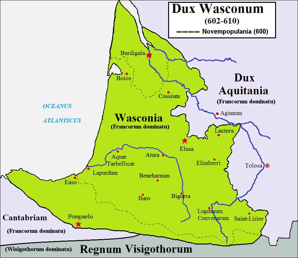 The early history of the House of Gascony is fragmentary and sometimes contradictory. As Gaul fell to various invaders after the collapse of the Roman Empire, the southern part of the old province of Aquitania was invaded by Vascons, a tribe of people from Iberia who later were known as Basques south of the Pyrenees and Gascons north of the mountains. In the conflicts between the Franks, the Burgundians and the Visigoths, they tried to forge their own territory, and around 600 were governed by a duke appointed by a Frankish king. This duke or military governor was probably a Frank or a Gallo-Roman, but in 670 we see a duke called Lupus who may have been a Vascon, and he changed the name of the region from the Roman Novempopulania to Vasconia. He extended his rule north to the Garonne river and fought off Visigoths to the east—chroniclers write that he wanted to be named king, but was murdered in 675 before achieving this goal.
