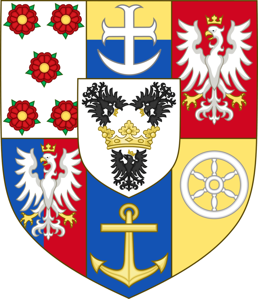 So by the late 1640s, the Eggenberg family bore a much more complex coat of arms: aside from the three ravens of Eggenberg, we see five red roses on silver for Krumau, a gold anchor on blue for Pettau, another anchor (with a cross on top) for Gradisca, a silver eagle on red for Aquileia, and a silver eagle on a divided red and blue field for the County of Adelsberg, another possession in what it now Slovenia (today called Poslojna).