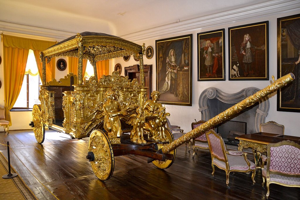 By 1630, Hans Ulrich was one of the most important statesmen in Europe, the premier minister of Emperor Ferdinand II. When he died in 1634, however, he had still not acquired the one thing he needed to be regarded as a true prince of the Holy Roman Empire: an ‘immediate’ fief. This meant a territory that was not held in vassalage to any other prince but directly from the emperor. This was the chief qualification needed for someone created a prince to be accepted by the other princes of the Empire and allowed a seat in the princes’ chamber in the Imperial Diet. This was therefore Hans Ulrich’s son Johann Anton’s chief goal. Unlike his father, he didn’t have the same political ambitions. But he was, like his father, very close to a Habsburg prince: Ferdinand II’s son Ferdinand III who succeeded as emperor in 1637. Johann Anton, the 2nd Prince of Eggenberg, had already taken over much of his father’s ceremonial role, as Governor of Carniola and Privy Councillor from 1635, and Chamberlain of Inner Austria. He organised Ferdinand II’s funeral in Graz (unlike most Habsburgs, Ferdinand did not wish to be buried in Vienna), and was given the tremendous honour in 1637 of travelling to Rome (in a brilliant golden carriage) to formally announce Ferdinand III’s imperial election to Pope Urban VIII. The golden carriage is still on display today at Český Krumlov.