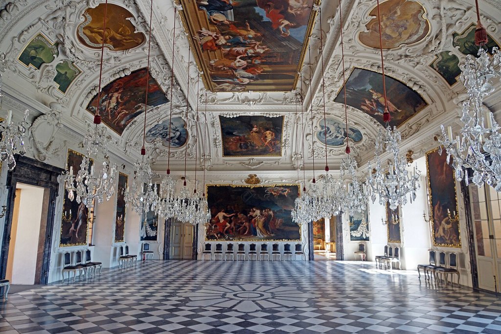 The trouble with the unfinished will was what to do with Gradisca—as a territory with a vote in the Diet it could not be divided. After several years of haggling, it was agreed that the eldest son, Johann Christian, would receive the Bohemian lands centred on the Duchy of Krumau, as well as the princely county of Gradisca (and thus the seat in the Diet). His brother Johann Seyfried received the Styrian and Slovene lands; he was the one who finally brought to fruition their grandfather’s vision for a princely palace outside of Graz. Here in 1673, Johann Seyfried received the huge honour (and as always, the enormous financial burden that went with it) of hosting Emperor Leopold I on the eve of his wedding to his cousin Archduchess Claudia Felicitas of Tirol. He continued to spend lavishly and soon was teetering on bankruptcy. He was forced to sell many of the lands in Slovenia and was ultimately saved by outliving his older brother and thus inheriting his share of the Eggenberg estates.